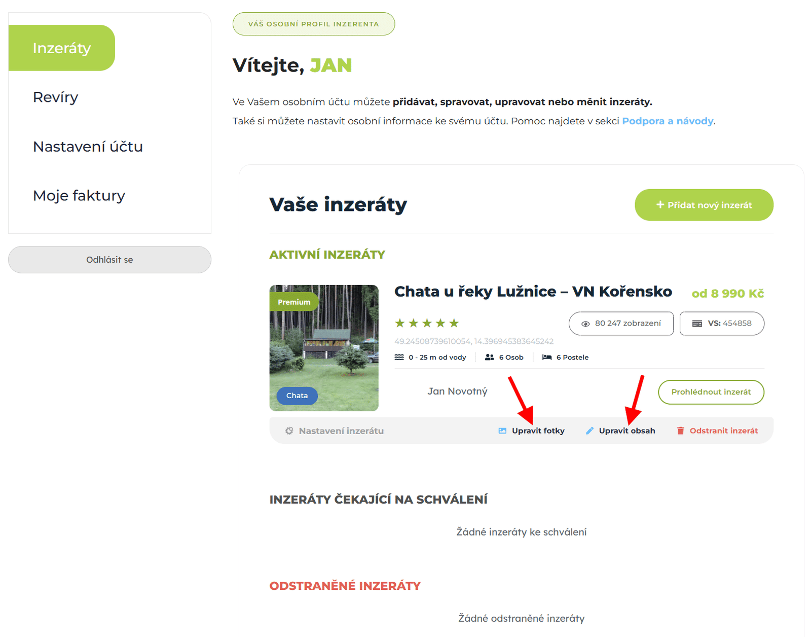 Ano, když se do našeho webu přihlásíte svým uživatelským jménem a heslem, tak můžete kdykoliv (zdarma) editovat každý inzerát, který jste do našeho katalogu vložili. Svoji inzerci najdete ve svém uživatelském profilu, odkud lze vše spravovat. Můžete si tak upravit texty, smazat nebo doplnit fotografie apod.
