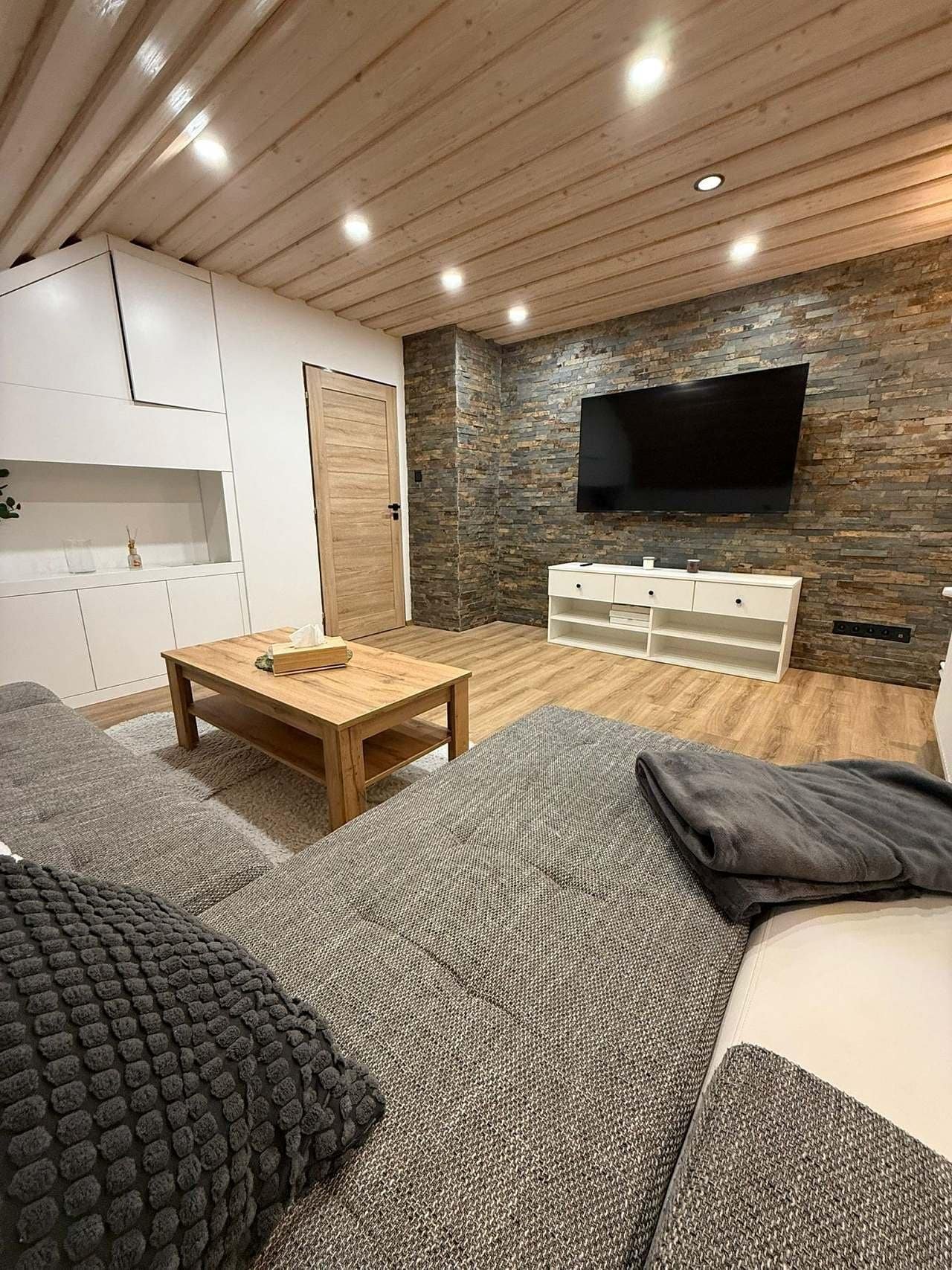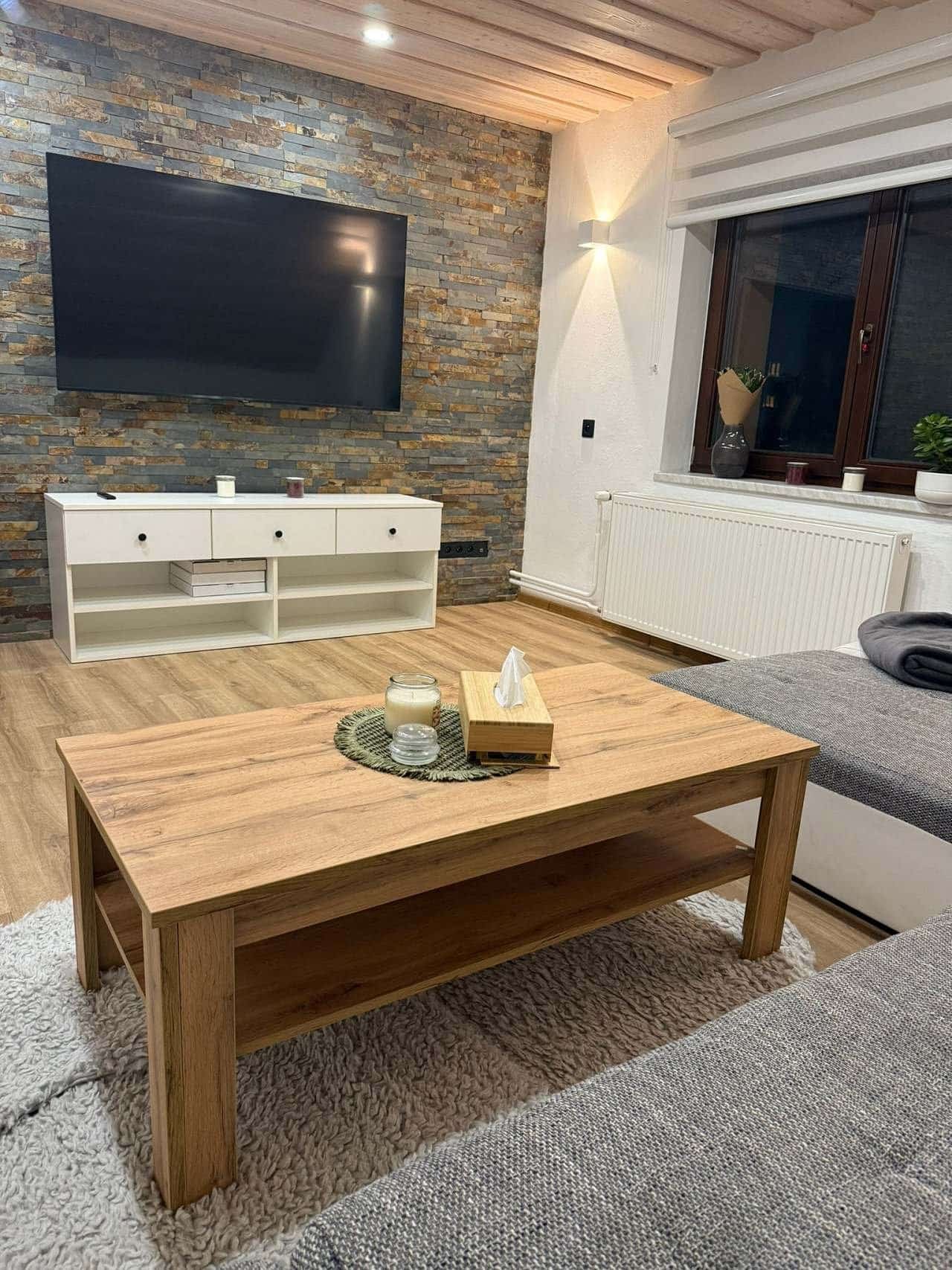 Obývací pokoj: Pohodlný rozkládací gauč (160x200 cm), který slouží jako přistýlka.