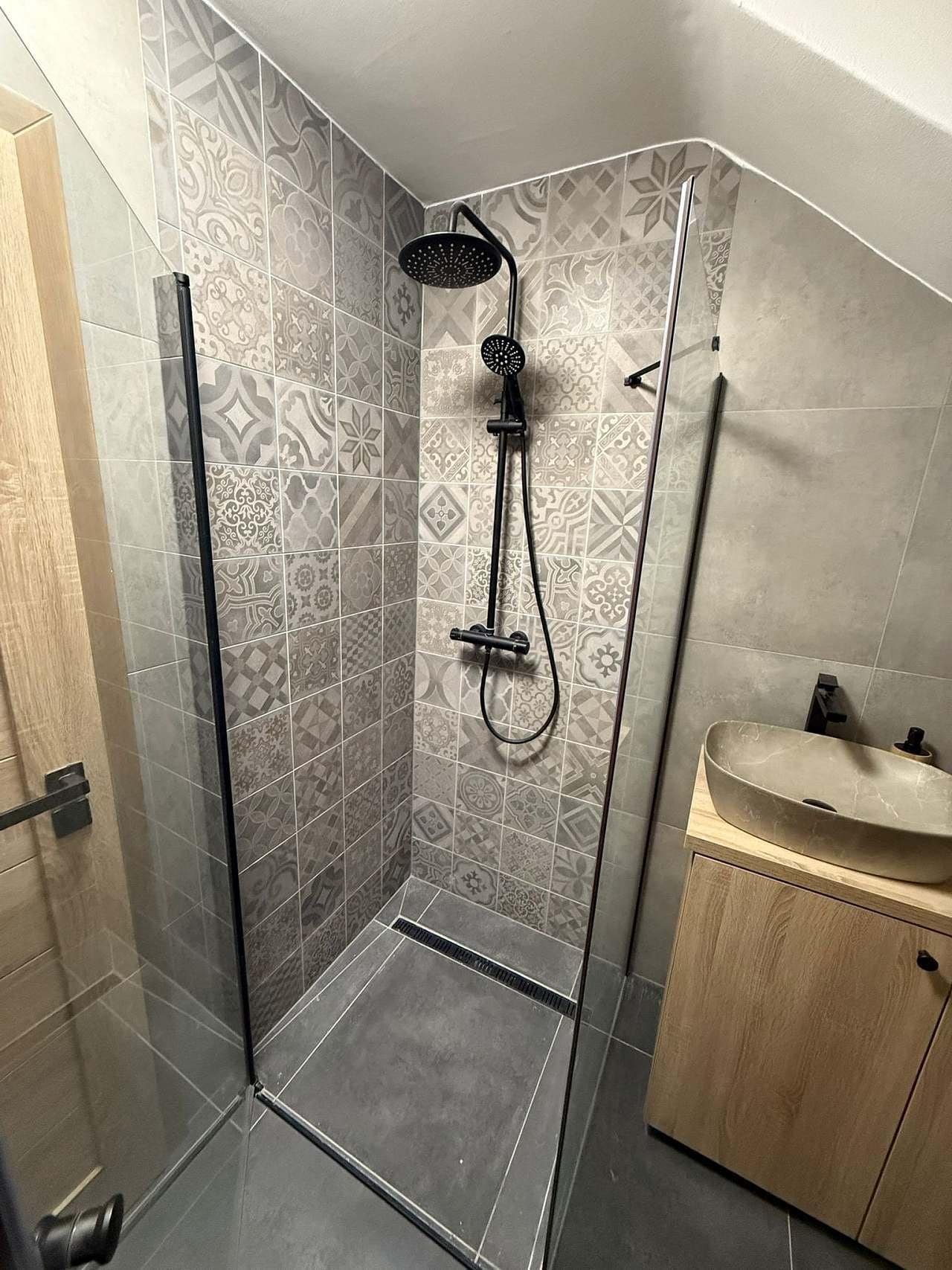 K dispozici je moderní koupelna s velkorysým sprchovým koutem a společným WC.