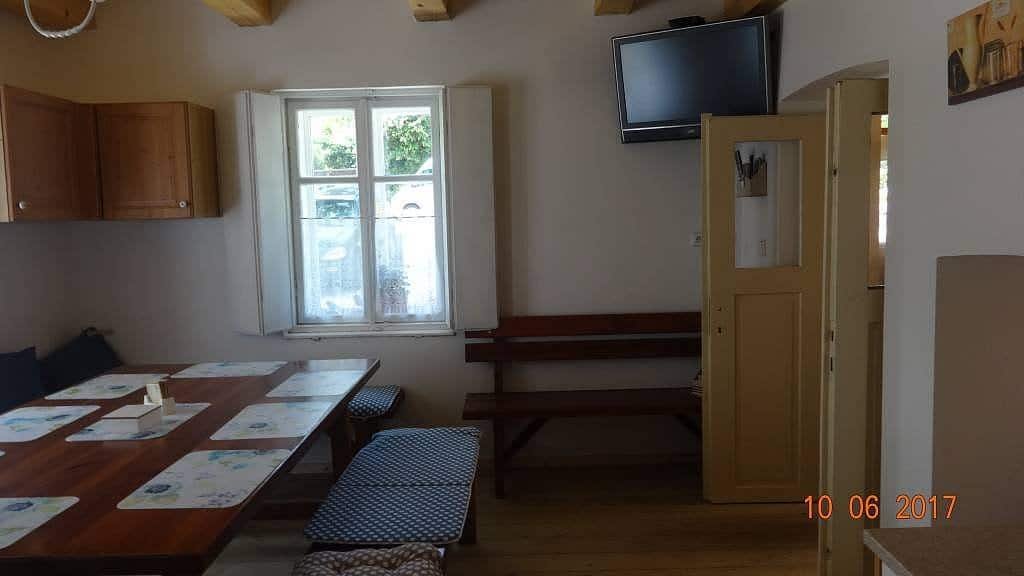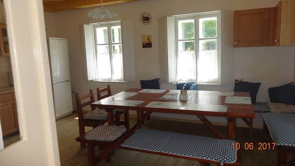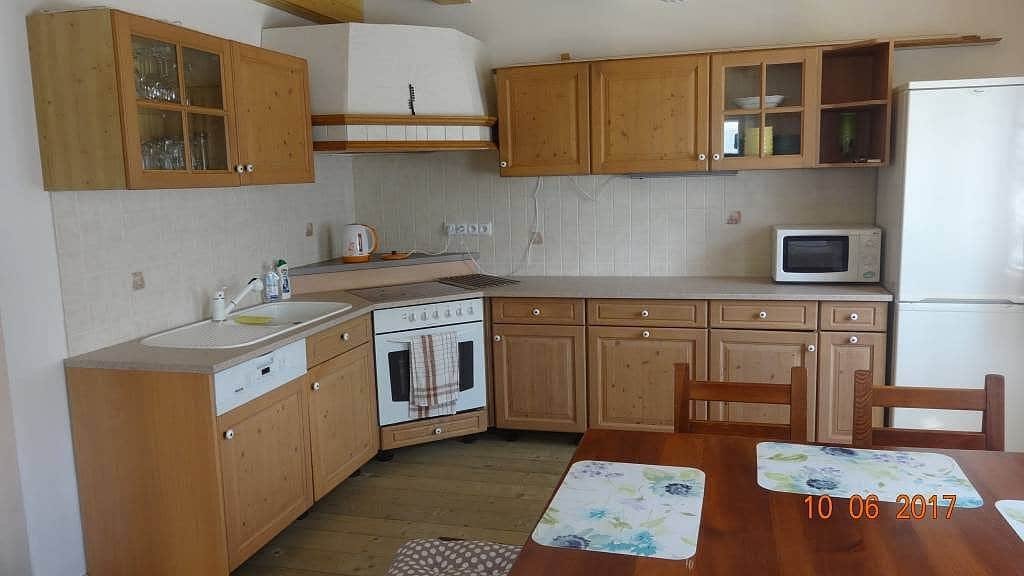Obytná kuchyně: Velkorysý prostor s jídelním stolem pro 12 osob a TV se satelitem. Kuchyně je plně vybavena (sklokeramická deska, trouba, mikrovlnka, myčka, velká lednice s mrazákem).
