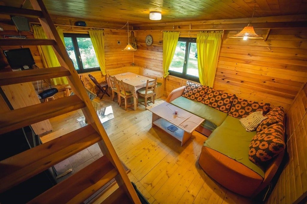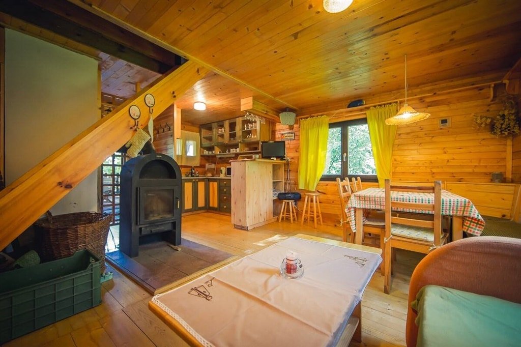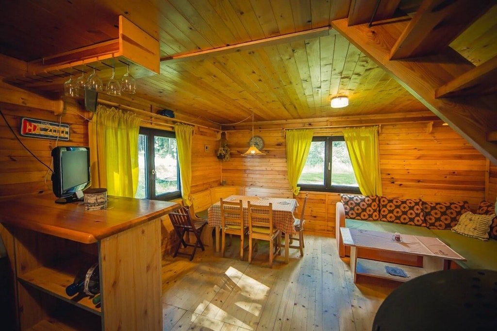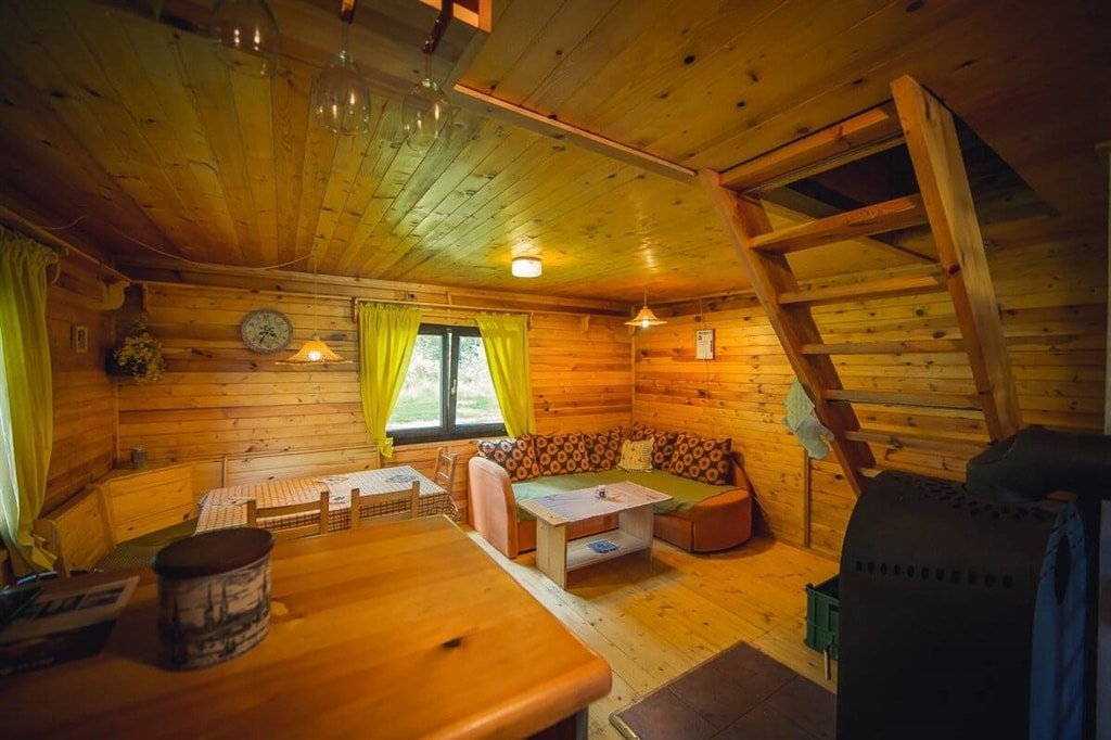 Přízemí: Dominantou je velkorysá obytná místnost s krbovými kamny, pohovkou a TV. Najdete zde i plně vybavený kuchyňský kout (varná deska, lednice, konvice) oddělený praktickým pultem a moderní koupelnu se sprchovým koutem a toaletou.
