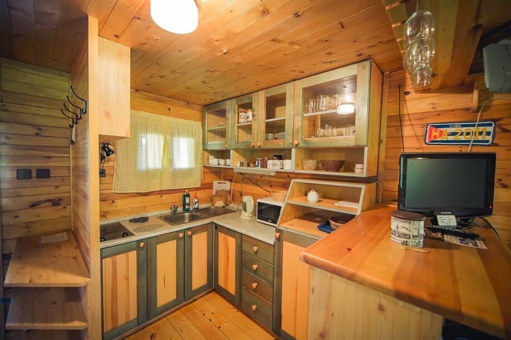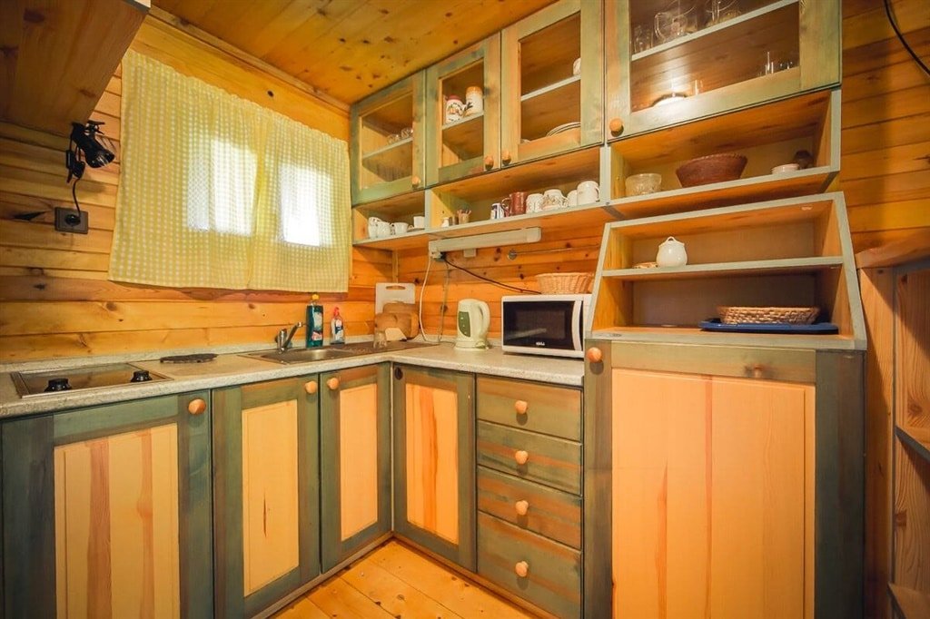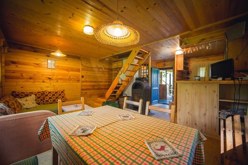 Pohovka, televize, vnitřní krb, jídelní sestava, rychlovarná konvice, mikrovlnná trouba,