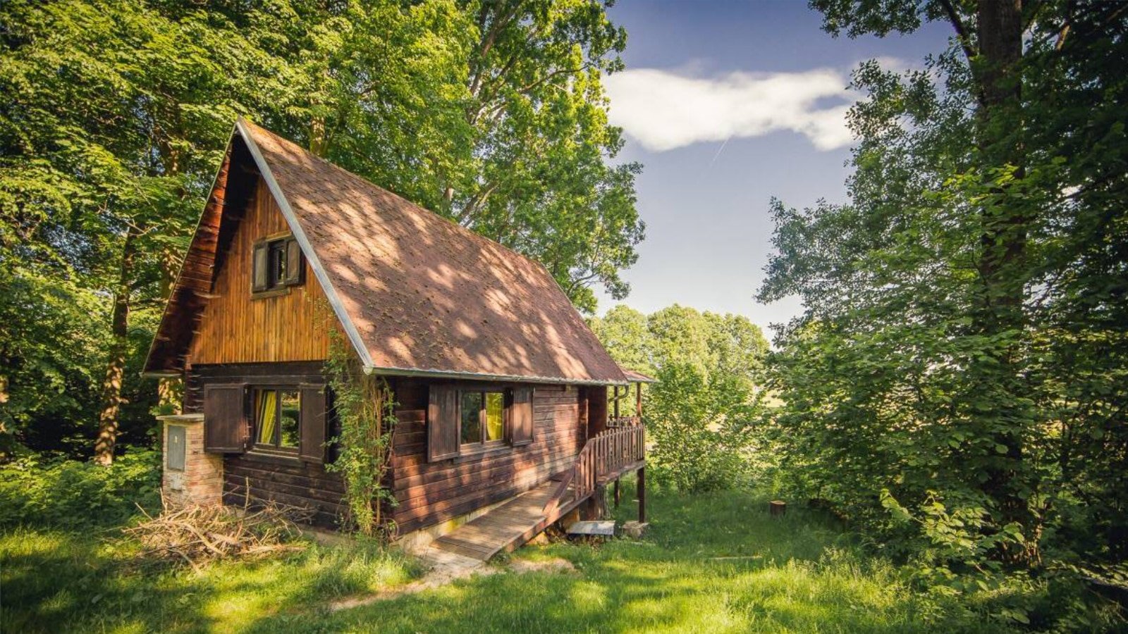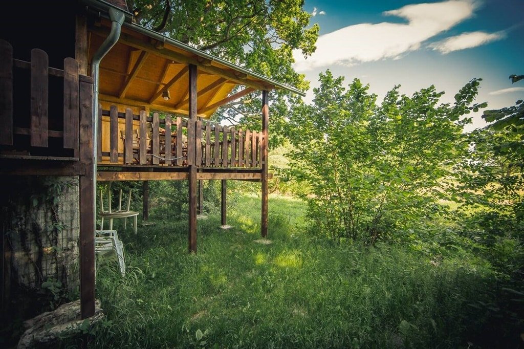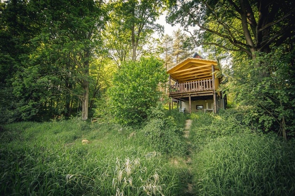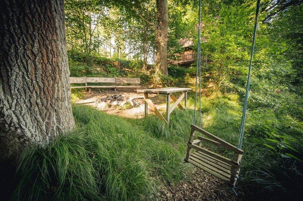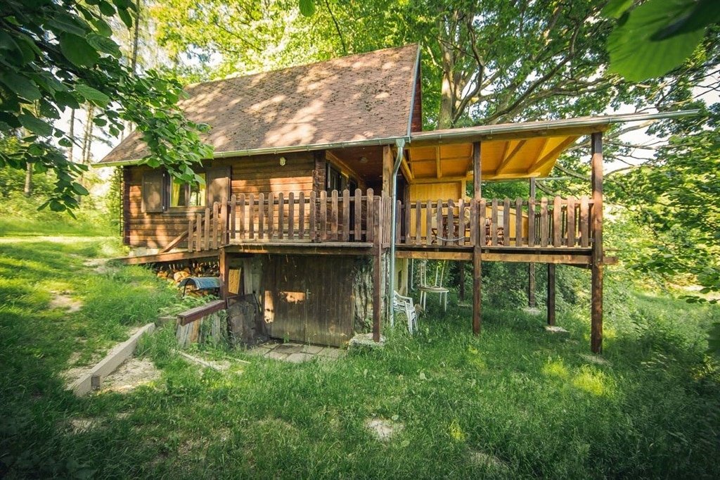 Zázemí a relax: Ve suterénu se nachází technické zázemí, kam bezpečně uložíte svá kola nebo rybářské náčiní. Za chatou se rozprostírá slunná louka pro dětské hry, zatímco přímo pod chatou na vás čeká přírodní ohniště s posezením a grilem pro večerní hostiny.