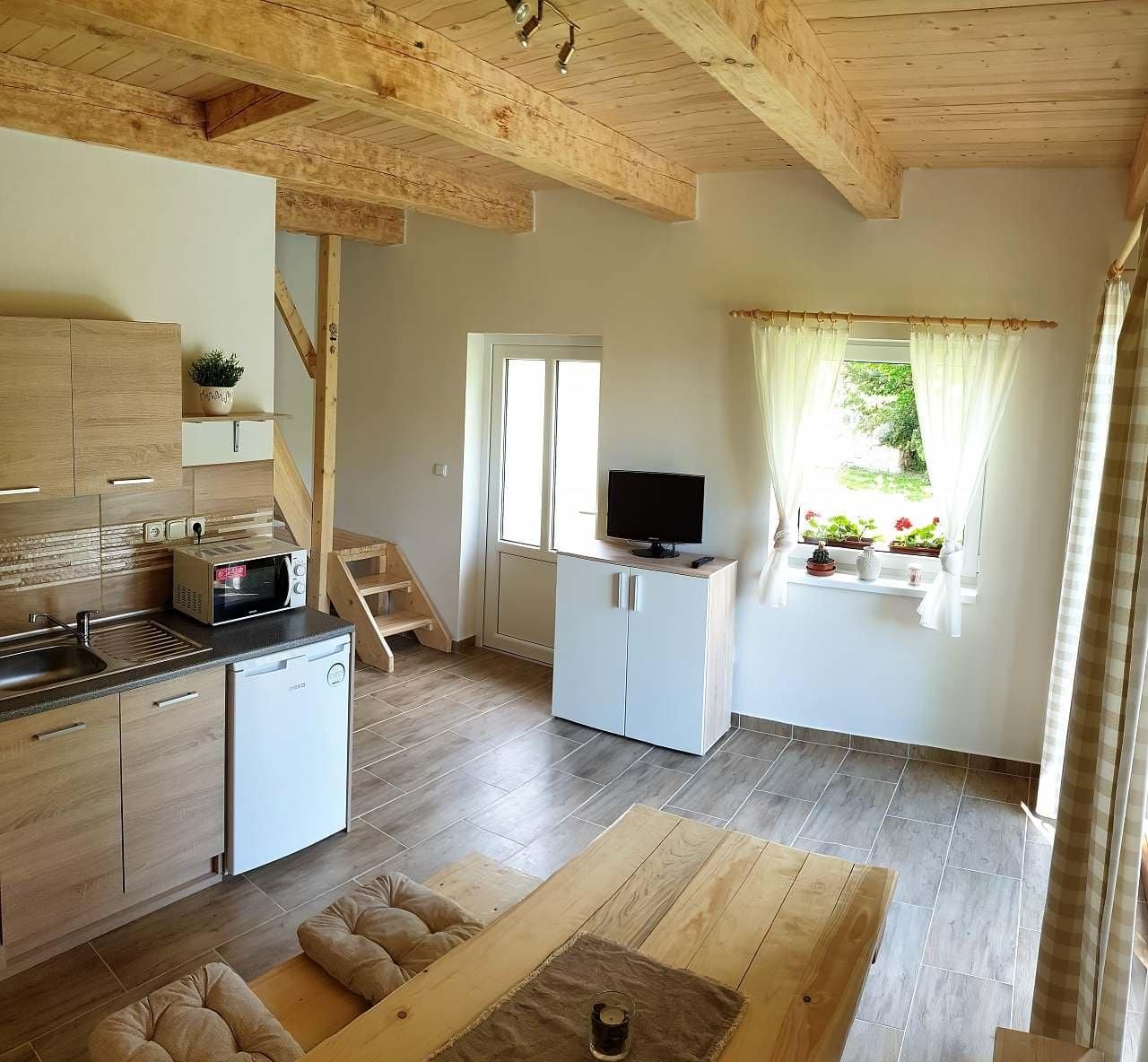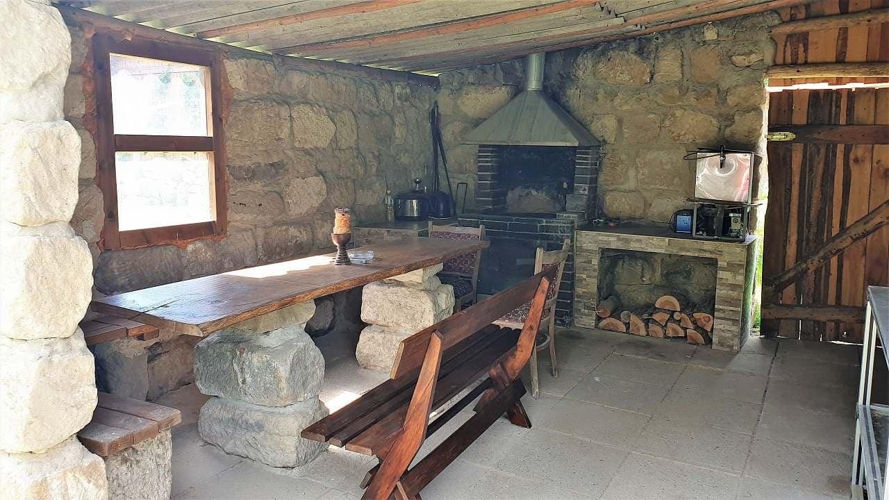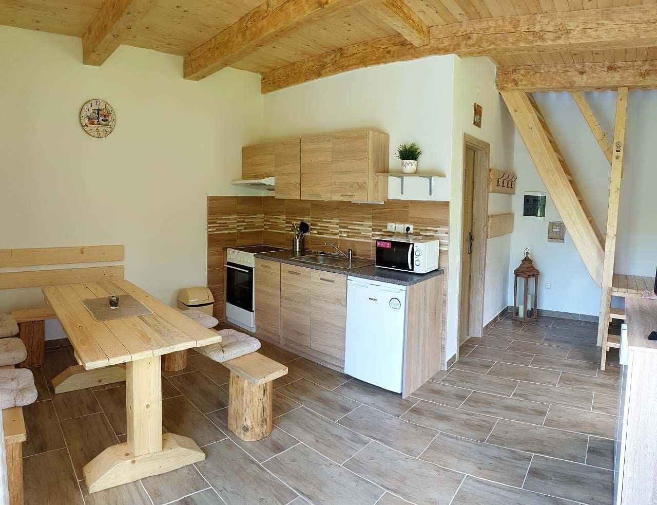 Lednice, mikrovlnná trouba, el. sporák s troubou, rychlovarná konvice, veškeré nádobí, TV, venkovní grily, ohniště, udírna, kotlík.