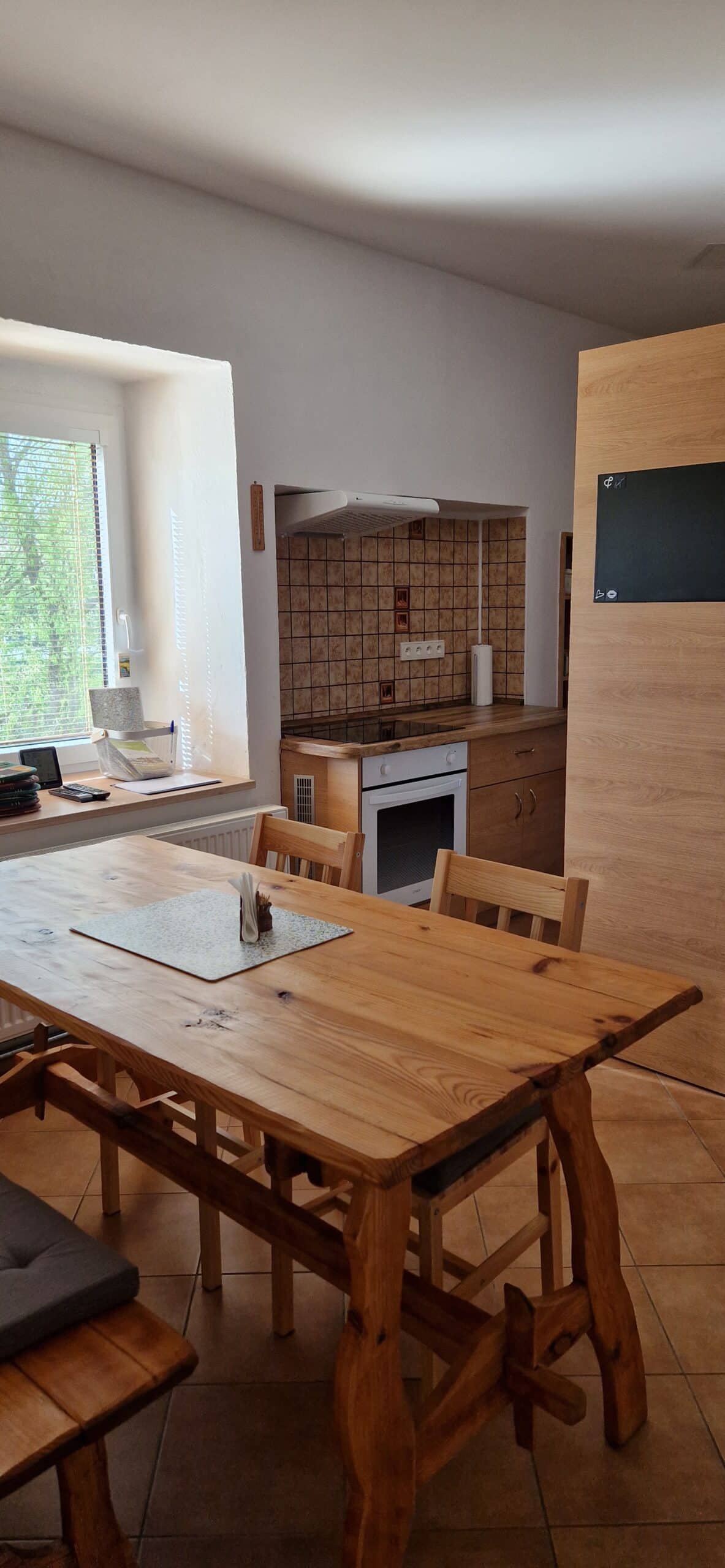 kuchyně je plně vybavena: základní nádobí pro vaření i servírování Vašich pokrmů, lednice s mrazákem, mikrovlnná trouba, rychlovarná konvice, varná deska (4 plotýnky) s troubou, kávovar na kapsle Dolce Gusto + jídelní kout s televizorem (dřevěný stůl, lavice a židle)